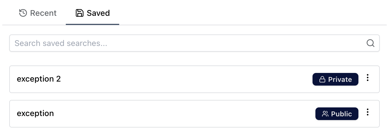 - Saved: Shows all saved searches. You can search by title. Public searches are visible to all project members; private searches are only visible to you.