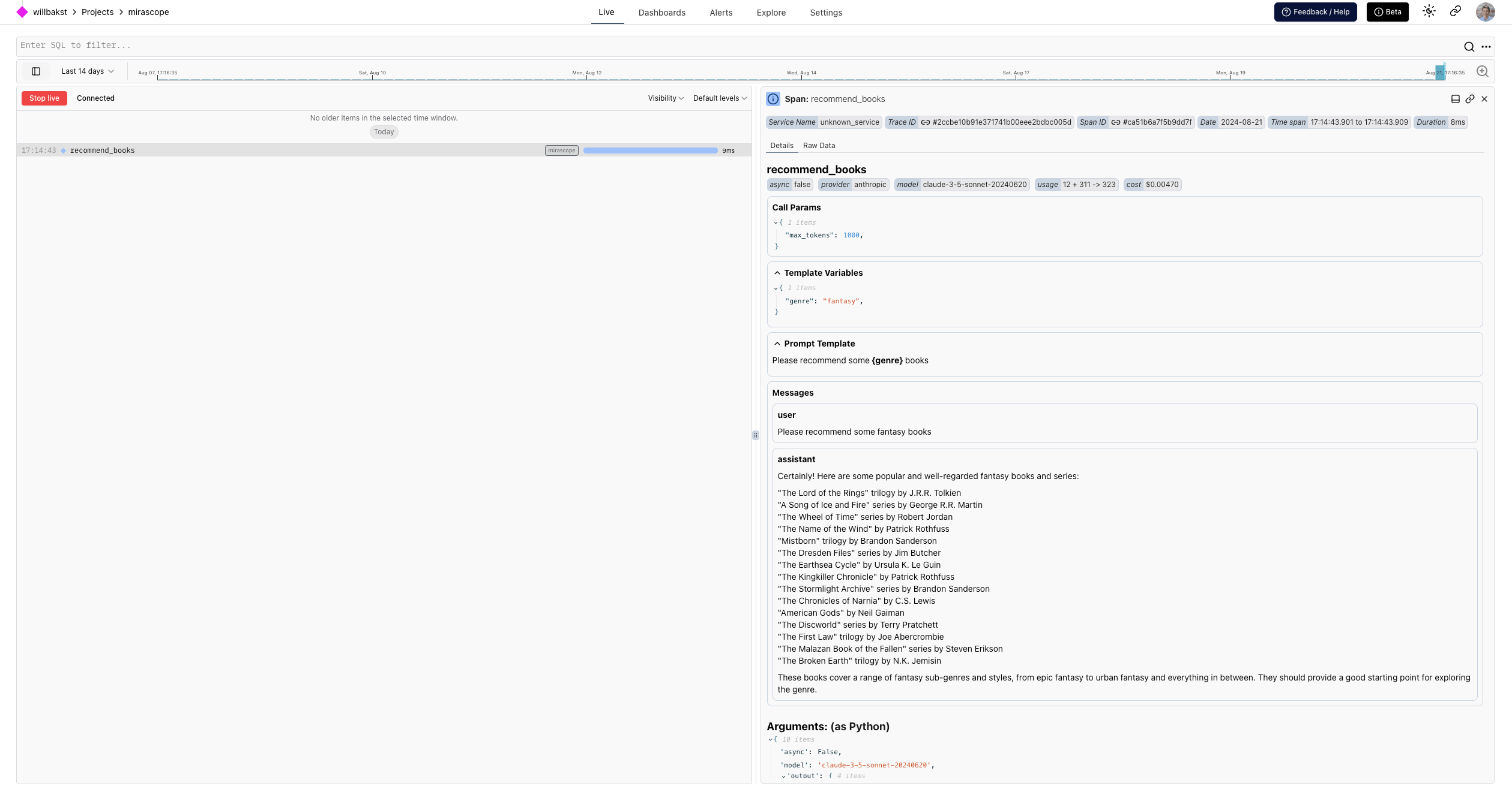 response = recommend_books("fantasy") # this will automatically get logged with logfire